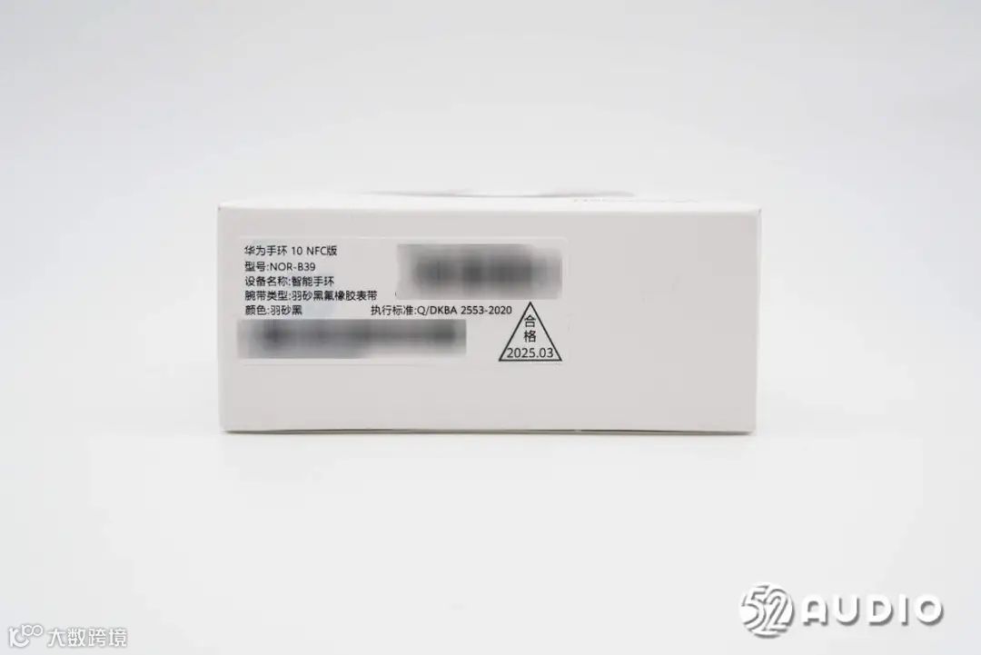 包装盒底部贴有出厂标签,华为手环10 NFC版,型号:NOR-B39,设备名称:智能手环,腕带类型:羽纱黑氟橡胶表带,颜色:羽纱黑。