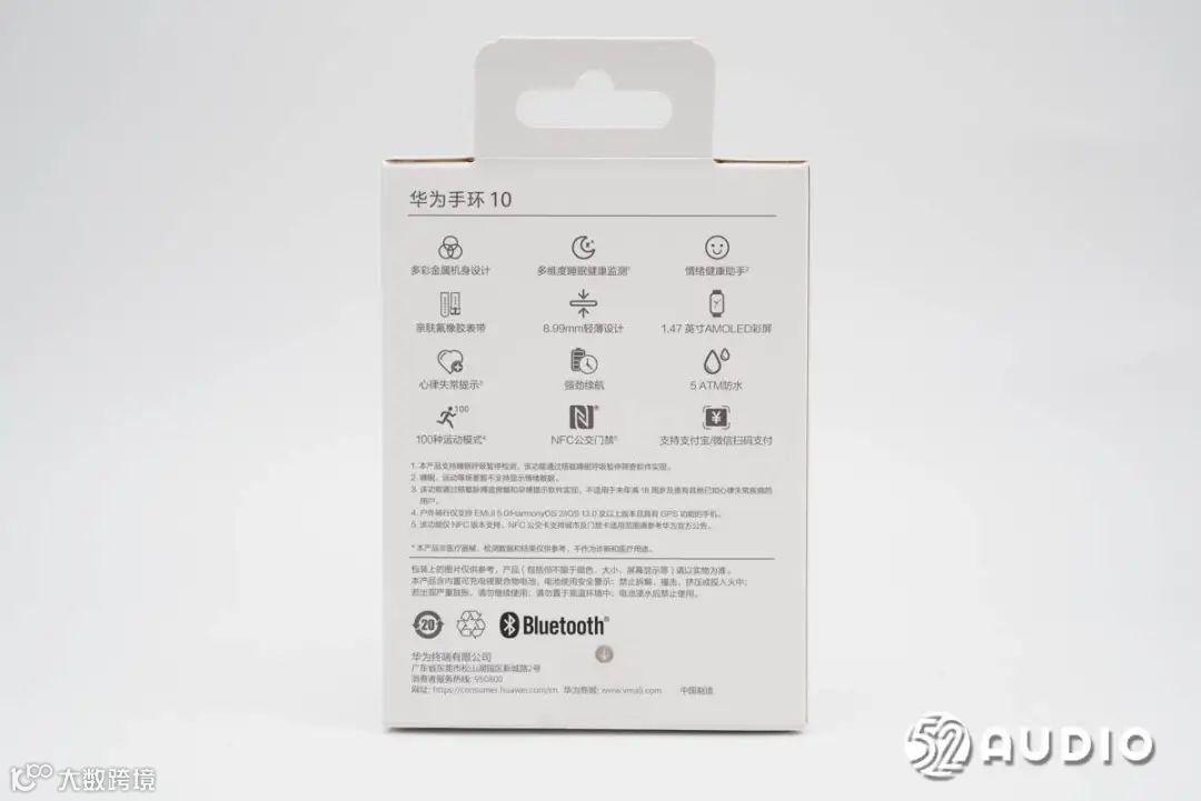 包装盒背面图文介绍了产品的详细功能特点:多彩金属机身设计、多维度睡眠健康监测、情绪健康助手、亲肤氟橡胶表带、8.99mm轻薄设计、1.47英寸AMOLED彩屏、心律失常提示、强劲续航、5ATM防水、100种运动模式、NFC公交门禁、支持支付宝/微信扫码支付。以及注意事项和华为终端有限公司部分信息。