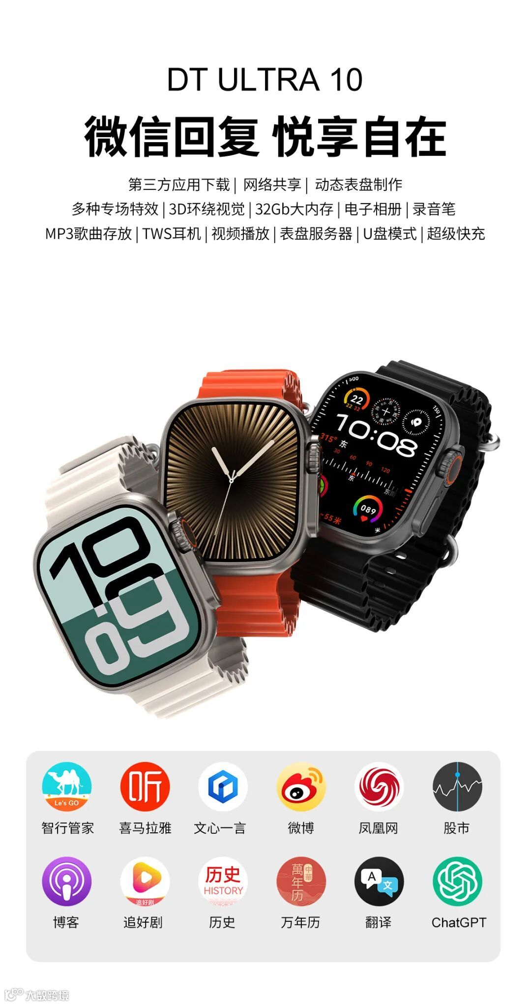 今天给大家重点推荐一下DT ULTRA 10的核心功能:WhatsApp回复;支持多语言回复和微信表情回复,支持一键回复微信,无需翻手机畅通对话!轻松处理日常工作与生活沟通,便捷无缝,随心而动,体验科技与生活的完美融合。