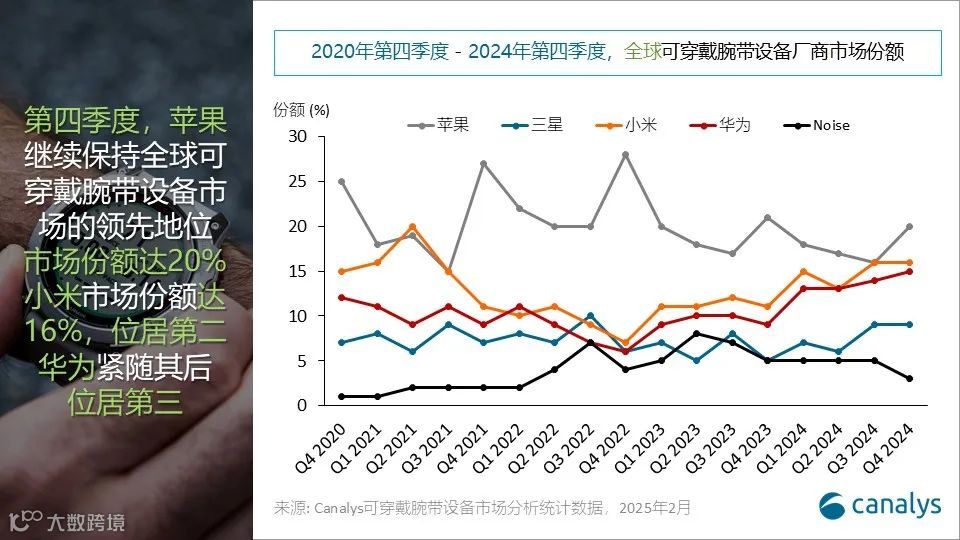 2024年,中国依然是全球最大的可穿戴腕带设备市场,出货量占全球30%,同比增长20%。得益于政府补贴、产品升级及生态整合等多重因素的推动,第四季度更是激增50%。