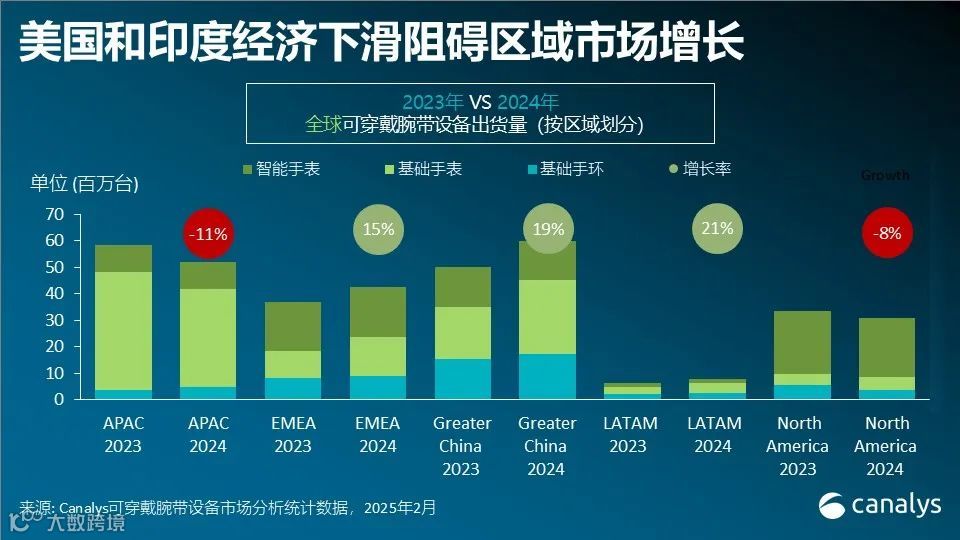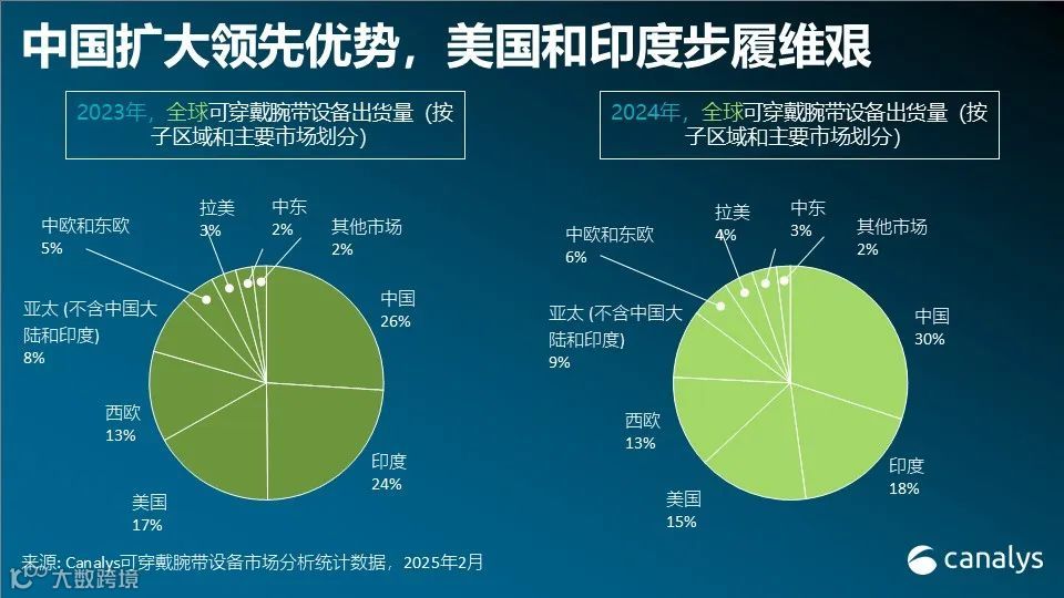 Canalys研究分析师Jack Leathem表示:“中国市场表现亮眼,而印度和美国则面临挑战,凸显出不同地区市场表现的差异。作为全球第二大可穿戴腕带设备市场,由于本土厂商在基础手表的功能和性能升级方面遇到挑战,并且该品类占印度市场出货量的96%,2024年印度市场出货量下降22%。