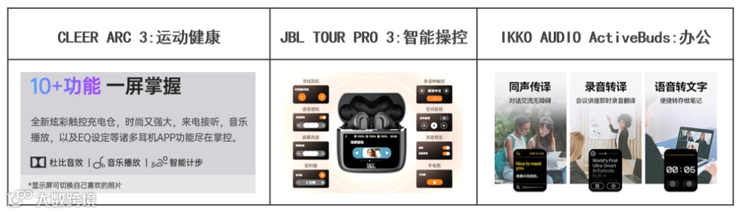 在耳机盒上搭载屏幕的耳机产品目前应用主要有三个方向:CLEER以AI+运动作为核心卖点,耳机盒屏幕用于智能计步等与运动相关的数据;JBL则主要是实现听音操控和耳机消息提示;IKKO AUDIO则侧重办公、会议场景。