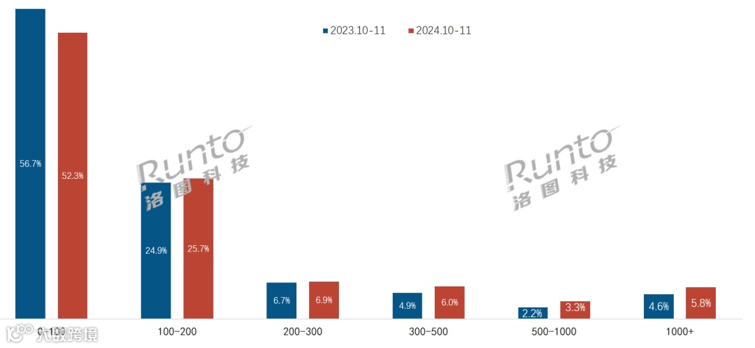 根据洛图科技(RUNTO)线上监测数据显示,2024年10-11月累计,中国耳机线上传统电商市场中,100元以内的耳机的销量份额下降了4.4个百分点,与此同时,100-200元、200-300元、300-500元、500-1000元、1000+元等各个价格段的销量份额均有不同程度的提升。