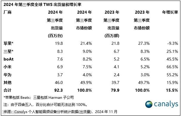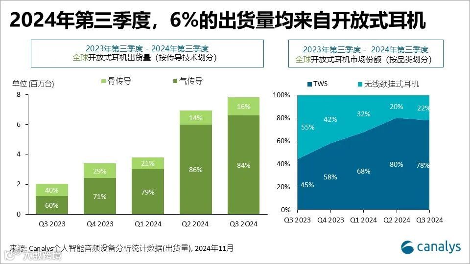 开放式耳机市场在2024年第三季度增速显著,这与全球健康及健身领域的增长态势相吻合,对开放式形态TWS和无线颈挂式耳机的需求激增,该品类的出货量占整体市场的6%,同比增速几乎翻了三倍。OWS设备是实现这一增速的核心推动力,主要来自于Shokz和Sanag等专业品牌。此外,主要厂商也纷纷进驻该细分市场,力图赢得新的客户群。