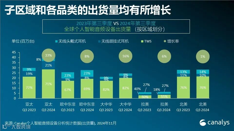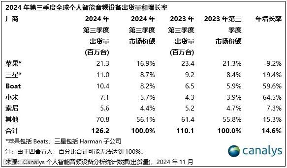 2024年第三季度,全球个人智能音频设备市场出现强势反弹,总出货量逼近1.26亿件,同比增长15%。这标志着该市场连续第三个季度迎来上升态势,表明其已脱离2023年遭遇的困境,实现持续回升。普遍性的增长令每个主要的子区域都有所获益。所有主要的产品类别均已实现两位数的增速,全球市场前景看好。其中,新兴的开放式耳机和中等规模的厂商做出了有力贡献。