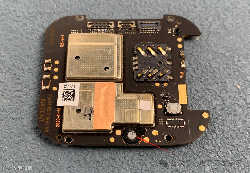 拿下主板,几乎所有的器件也都是放在屏蔽壳下面的。左侧在外面的金属壳器件是MIC。收声孔在肚子下面,PCB板上有开孔。