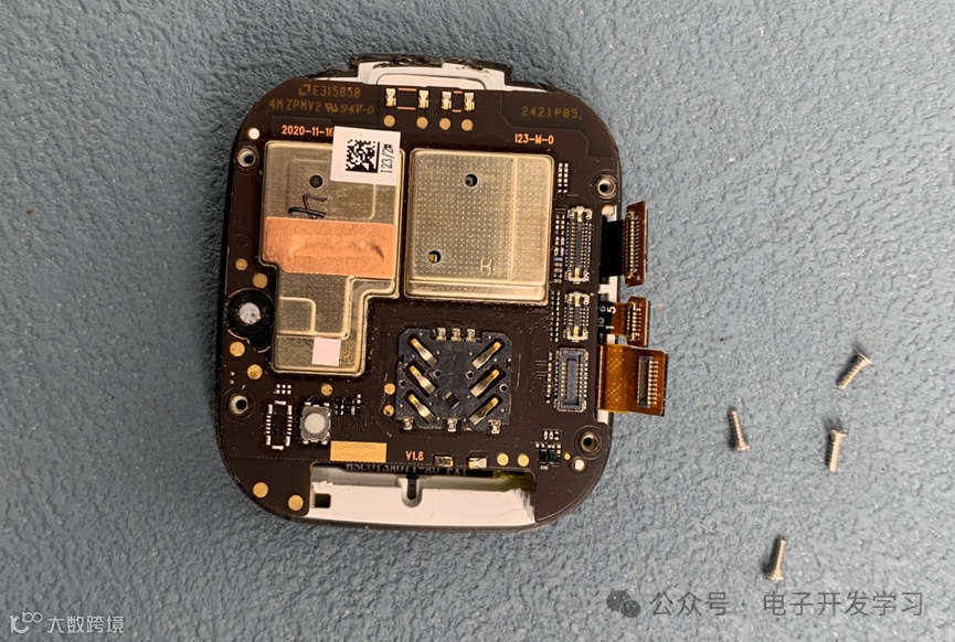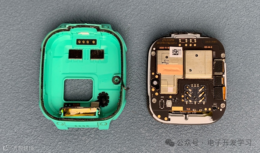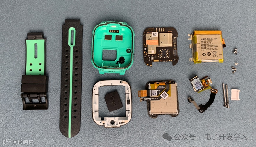 这是拆解换屏过程中拍的小天才手表的全家福。由于换屏之后就好了,没能报废,所以也就没机会看看屏蔽壳下面用的什么芯片方案了,这个有点遗憾。