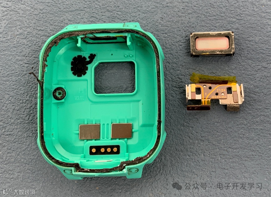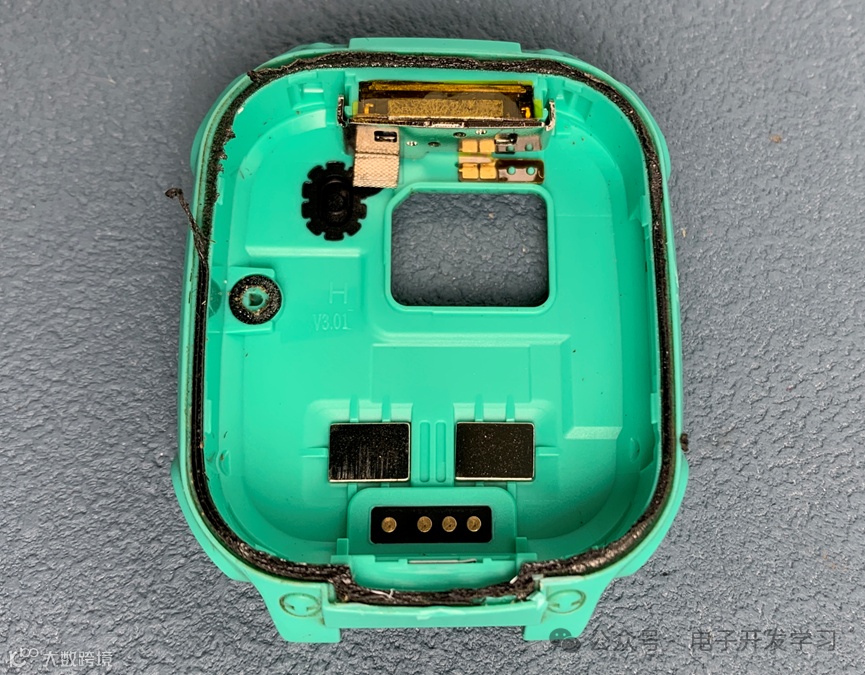 表壳上面的充电触点接进来之后,和主板上的弹片压在一起。左侧黑色的圆孔是mic孔。上面是扬声器。