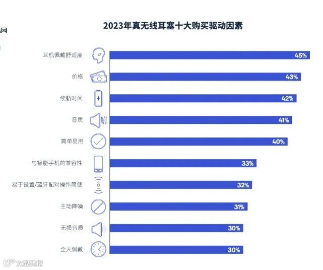 开放式耳机为何突然爆火?背后的原因与用户习惯的改变其实有直接关系。这里分享一下高通在2023年发布的《音频产品使用现状调研报告2023》。报告对消费者购买耳机的驱动因素进行了调查,结果显示「耳机佩戴舒适度」首次超过了价格、音质等因素,成为消费者的首要考虑因素。