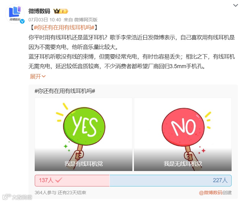 微博有一项是否还在用有线耳机的投票,投票结果显示,目前 37.6% 的用户是有线耳机党,62.4% 的人是无线耳机党。