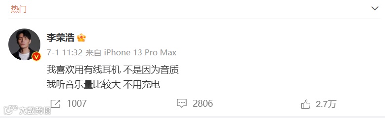 回归有线耳机,我不是个例,前段时间,李荣浩也发微博表示,他一直在用有线耳机,与音质无关,而是他听歌量大,使用有线耳机不用充电。