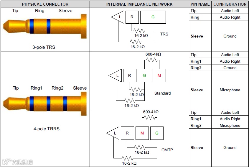 每一节对应一个触点,尖头的触点叫尖(Tips),连接左声道信号,中间的触点叫环(Ring),连接右声道信号,最上面的是套(Sleeve)这样的连接头叫 TRS。