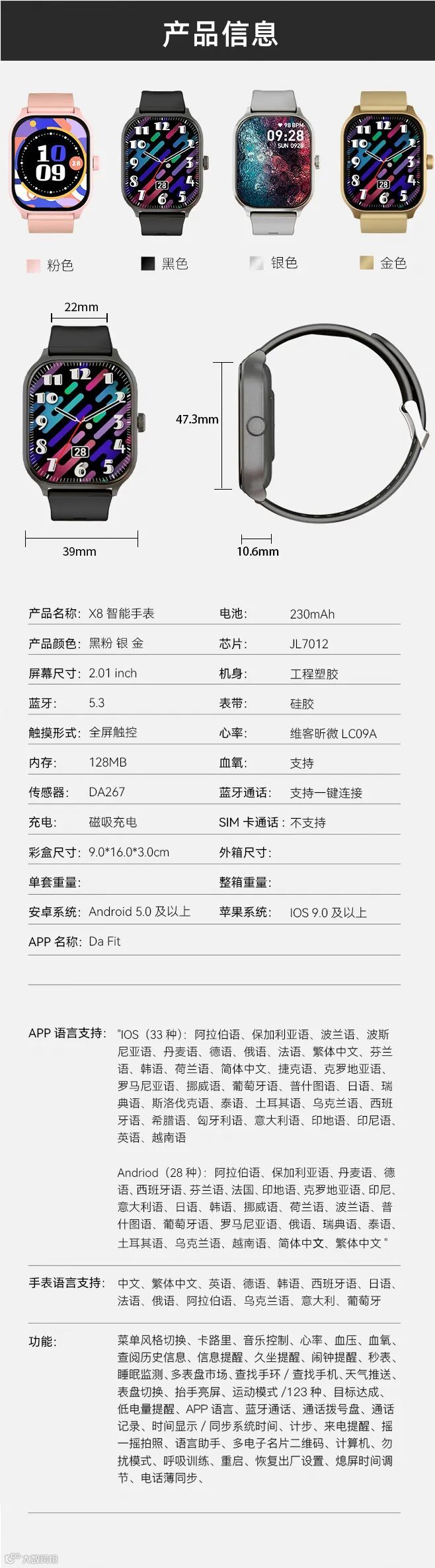 手机变成智能手机,手表变成智能手表,一切朝着智能的方向发展,今天让我们看下科速电子推出了一款的智能手表:X8,X8机身重量39G,轻便无感,佩戴更舒适。采用JL7012芯片,蓝牙BLE和蓝牙音频技同时运行也能独立运行,唤醒睡眠模式更快。