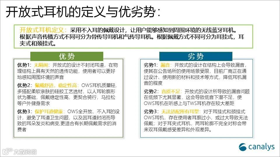 全球经济放缓,无线耳机市场需求疲软。后疫情时代人们健康意识的提高,以及对运动和户外活动等健身方式需求的增加,OWS (Open Wearable Stereo)作为开放式耳机的一种,进入人们视野并迎合了消费者对运动耳机的需求。同时,开放式耳机不堵塞耳道的设计,不仅解决了堵塞耳道可能造成的健康隐患,还提供了更舒适的佩戴体验,为无线耳机市场带来了新的增长机会。