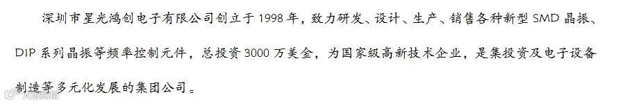 深圳市星光鸿创电子有限公司创立于1998年,总部位于广东深圳,总投资3000万美金,致力研发、设计、生产、销售各种新型SMD晶振,是集投资及电子设备制造等多元化发展的晶振集团公司。