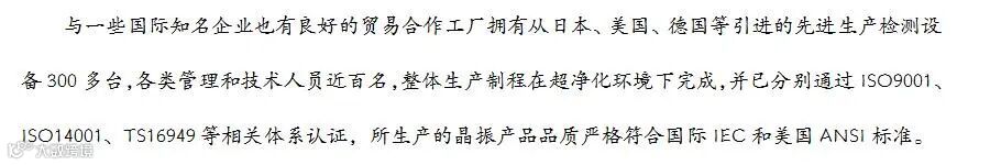 星光鸿创工厂拥有从日本、美国、德国等引进的先进生产检测设备300多台,各类管理和技术人员近百名,整体生产制程在超净化环境下完成,并已分别通过ISO9001、ISO14001、TS16949等相关体系认证,所生产的晶振产品品质严格符合国际IEC和美国ANSI标准。