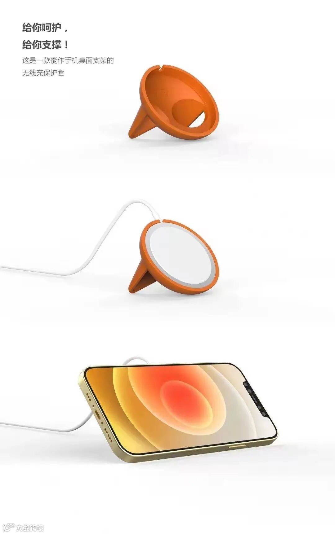 仿生设计,灵感来源是猫咪。采用了猫耳朵和猫屁股的形态并抽象化,趣味性十足。包裹苹果无线充电器,横竖摆放皆可。