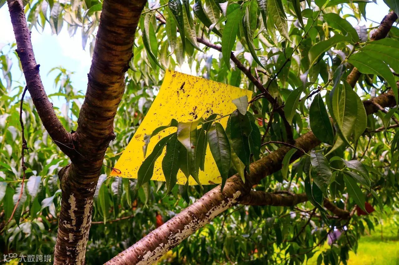 从花期开始,他的工作就开始忙碌起来;保证了这里的黄桃无丝毫污染。每棵树都要挂上粘蚊虫用的板子,采用物理防控的措施,也是保证纯天然、无残留的关键。