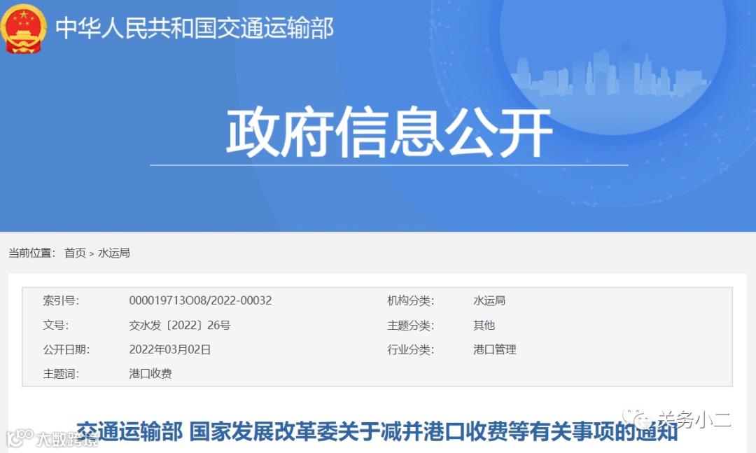 2022年3月2日,交通运输部 国家发展改革委公开发布关于减并港口收费等有关事项的通知,详情如下: