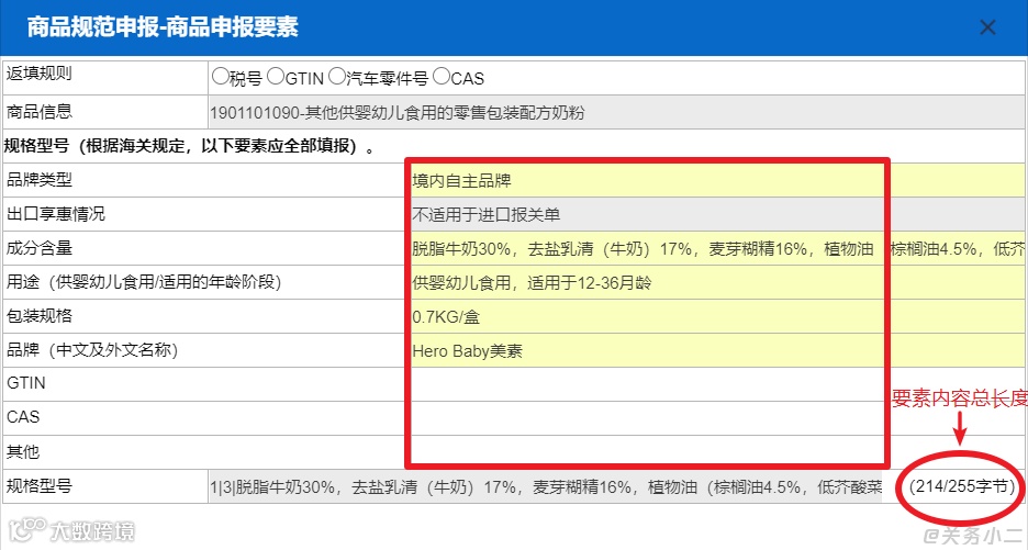 19011010项下商品“用途”要素一定要申报婴幼儿配方奶粉适用的年龄段,“品牌”要素同时申报中文及外文名称。