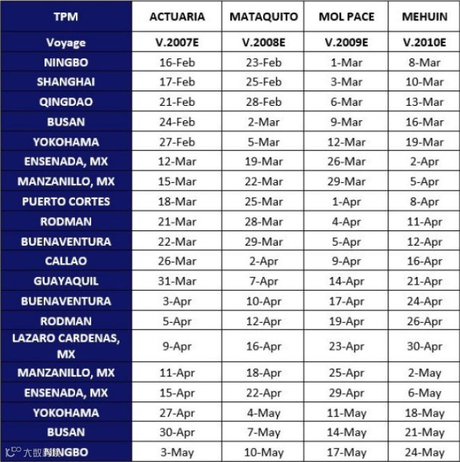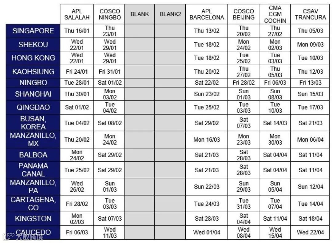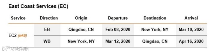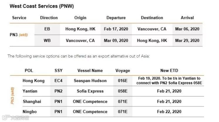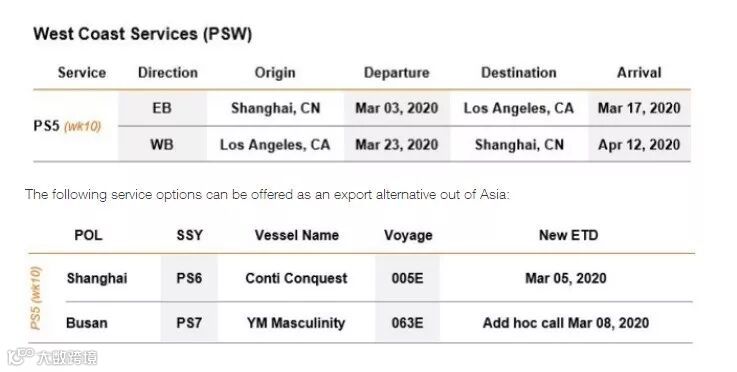 的出口货物已经装船,将前往釜山。在釜山,运往萨凡纳和查尔斯顿的货物,将通过EC1航线(Northern Jamboree 103E)转运,预计2月21日从釜山出发;运往纽约、波士顿和威尔明顿的货物,将通过下一班EC2航线(Nagoya Express 058E)转运,预计2月29日从釜山出发。
