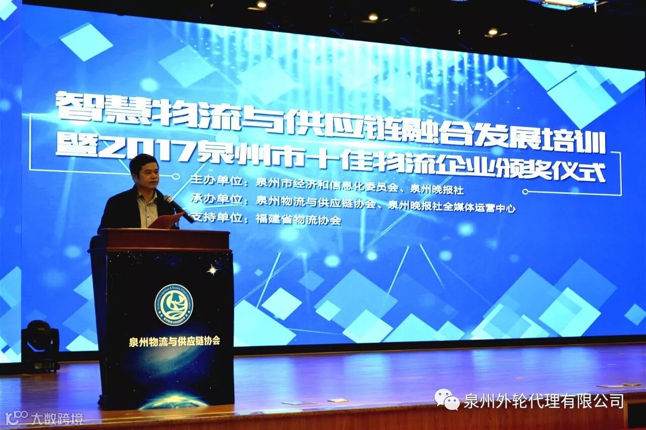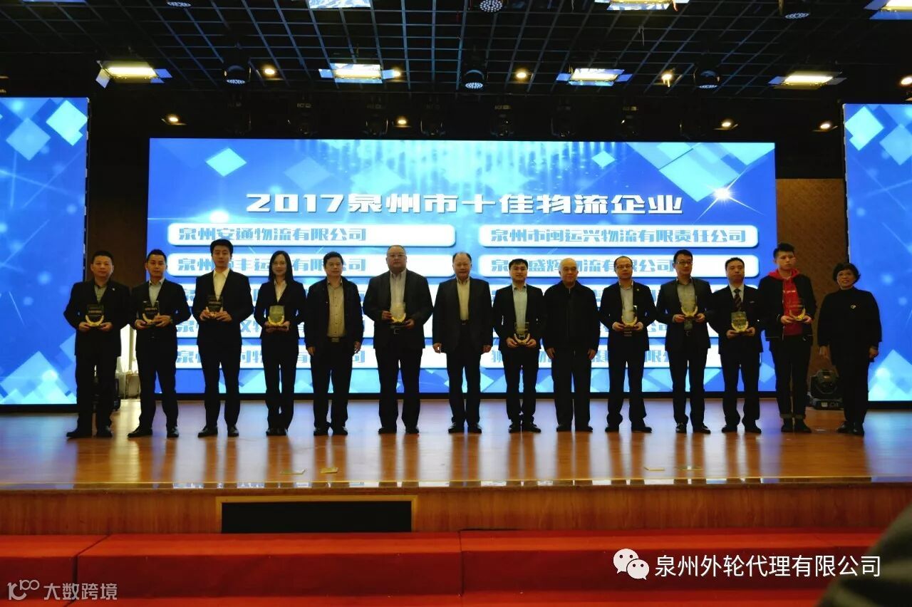 2017年12月8日下午3时,智慧物流与供应链发展融合培训暨2017泉州市十佳物流企业颁奖典礼在泉州海丝博亚国际中心隆重举行,泉州外轮代理有限公司荣获2017泉州市十佳物流企业。泉州外轮代理有限公司施志建总经理、刘刚副总经理、陈劲松副总经理(泉州外代物流有限公司董事长)、泉州外代物流有限公司洪家福总经理代表我司参加此次颁奖典礼。