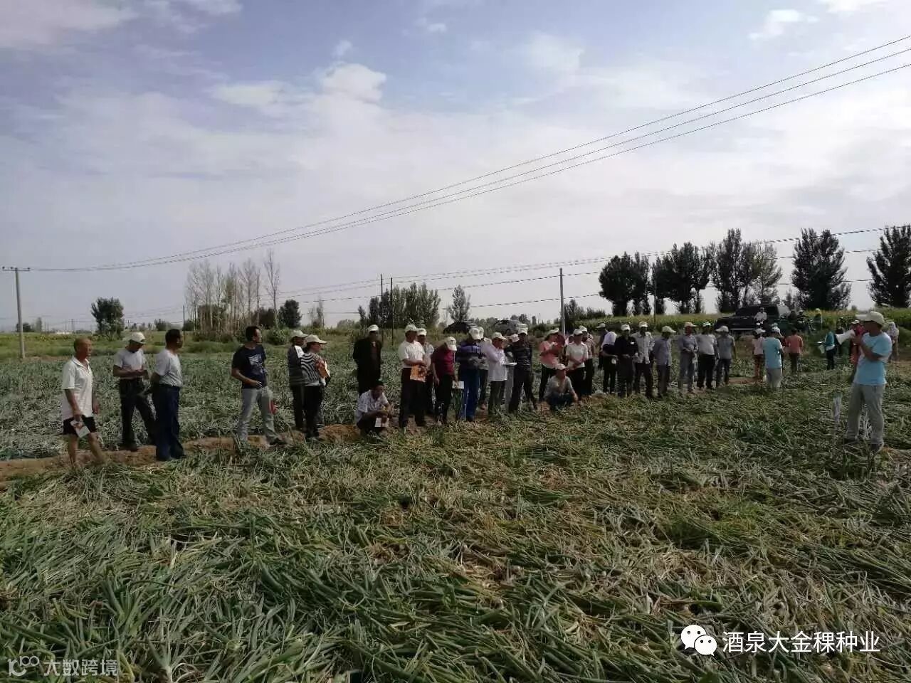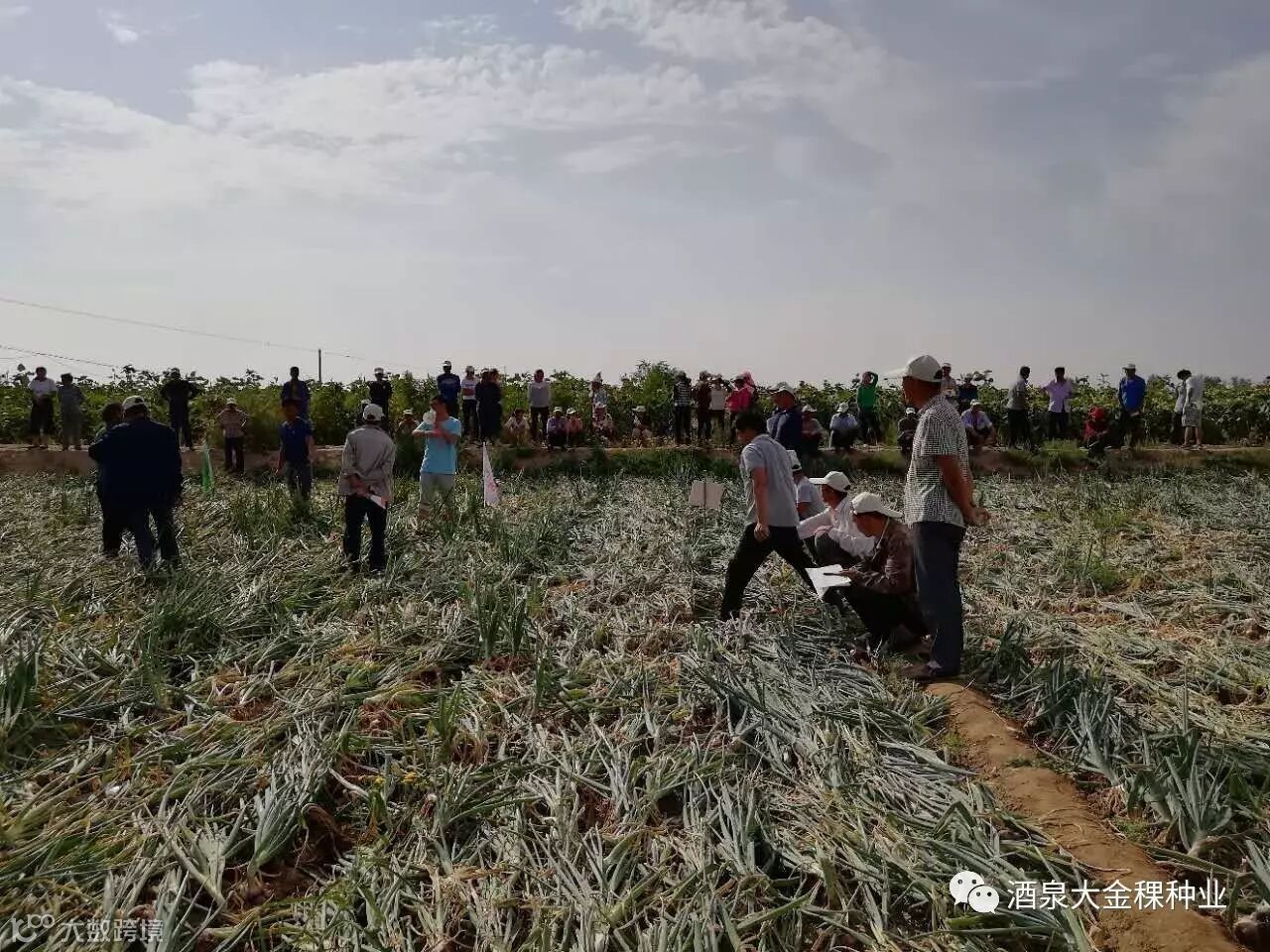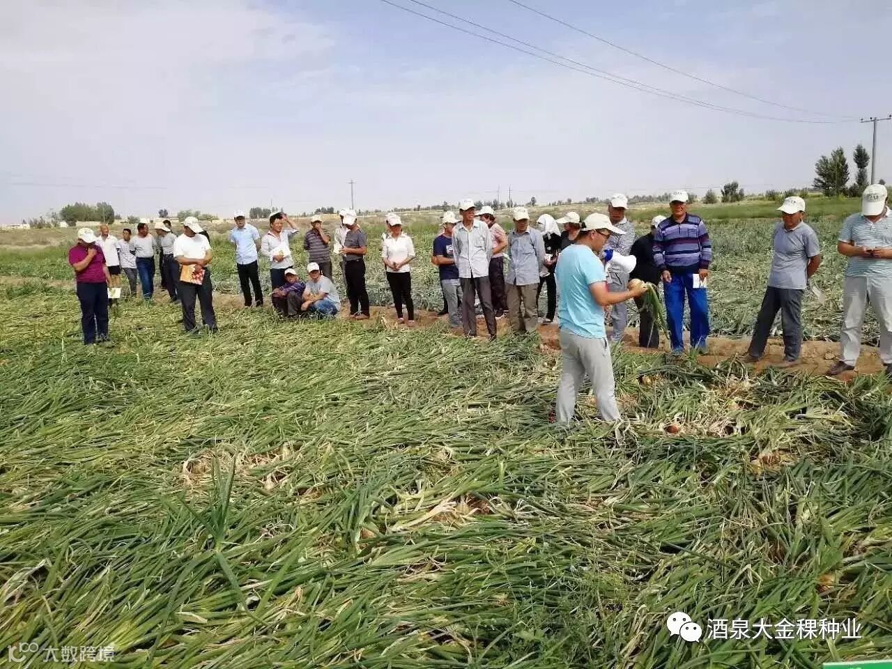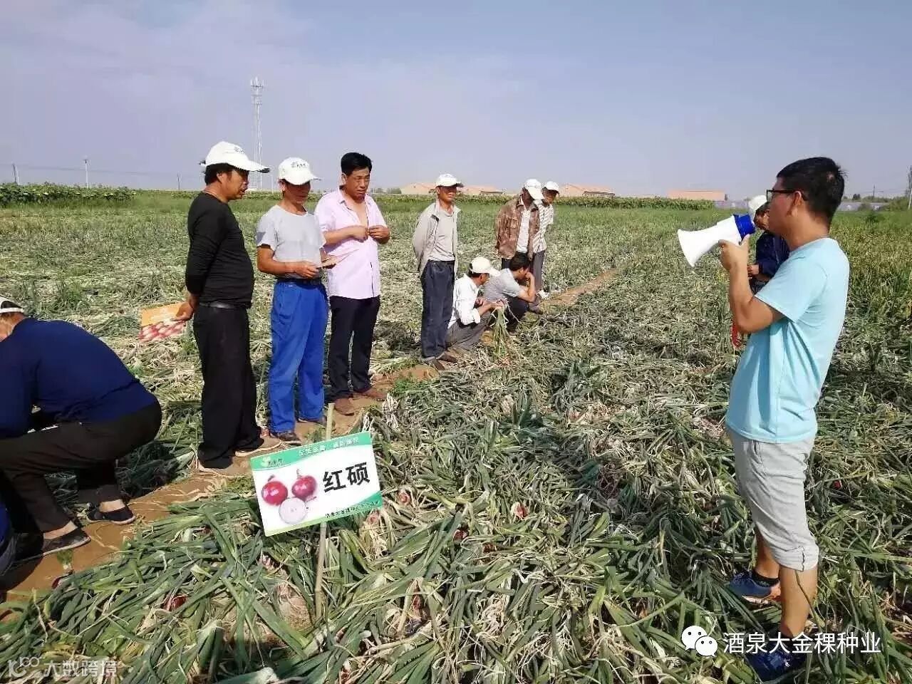 2017年8月16日,早上9点,酒泉市大金稞种业在永昌县朱王堡镇北大滩祝兆荣的地块举办了洋葱品种观摩会,参会人数达70多人,武威黄羊河的领导莅临现场,并查看了观摩田,现场气氛一度达到高潮。这次观摩会的品种主要有:金宝,罗塔,金稞6号,红硕,红娇,红剑,新红奇2号。尤其红硕、新红奇2号、罗塔表现优秀,得到参会人员的一致好评。