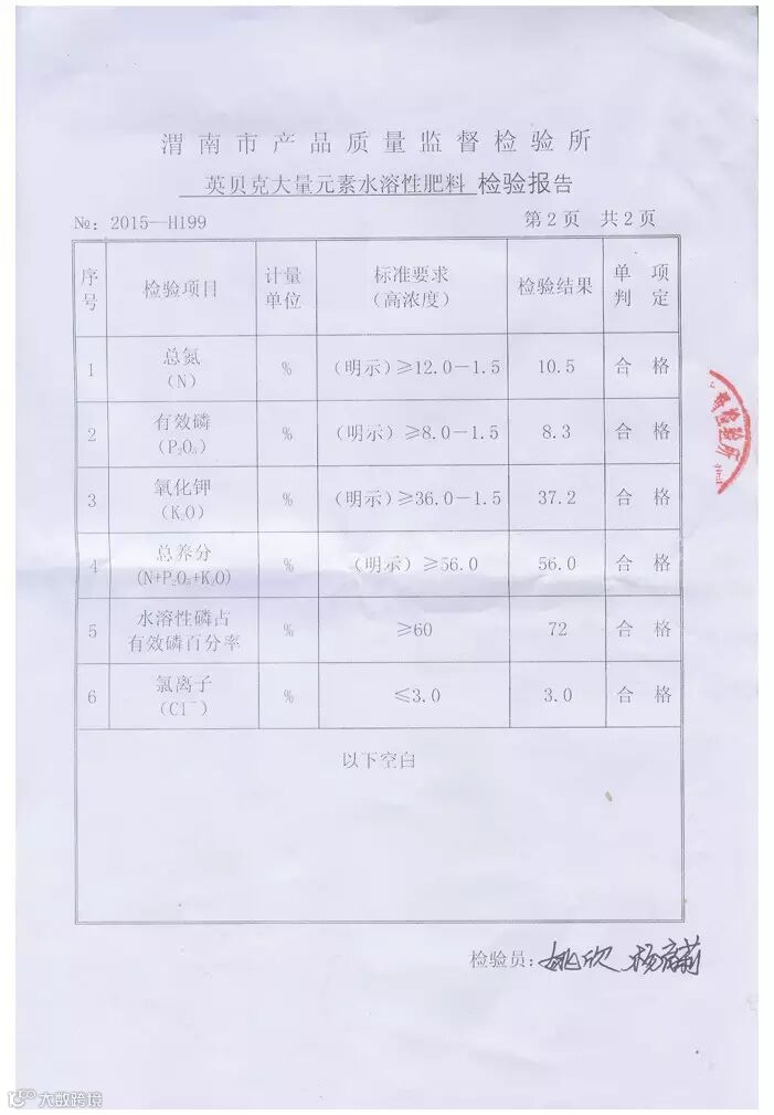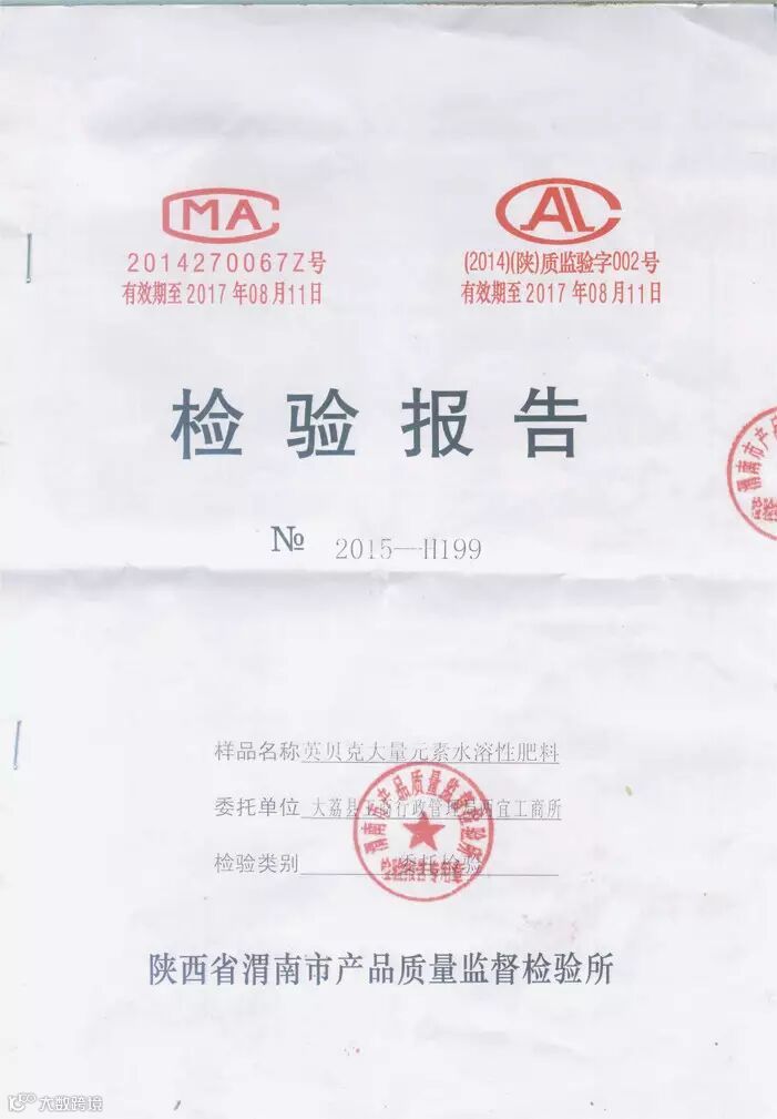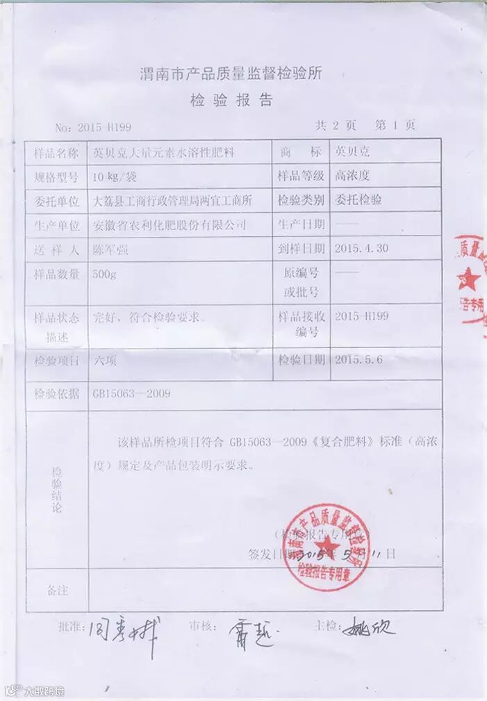 2015年5月11日,陕西省渭南市产品质量监督检验所,对包括安徽省农利化肥股份有限公司的大量元素水溶肥产品--英贝克在内的8家肥料厂家的产品进行了抽检,仅有安徽农利的产品达标。
