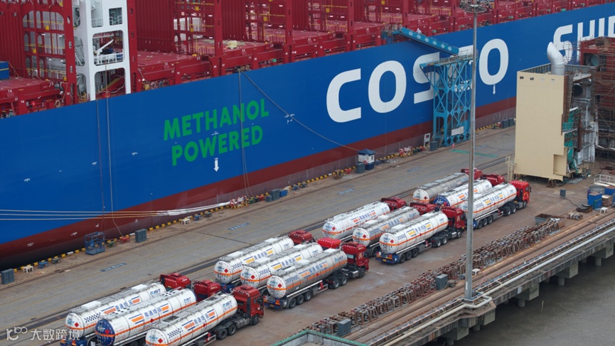 自主设计、建造12艘甲醇双燃料24000TEU集装箱船,投入运营后,每年将减少碳排放约130万吨。