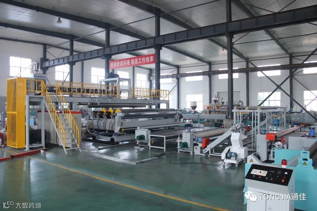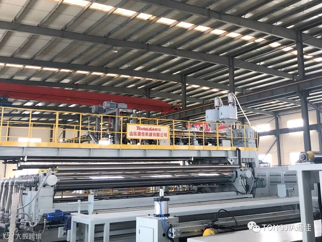 随着国内外大批高端土木工程项目的陆续开工建设,大幅宽高端品质的土工膜产品越来越受到行业的青睐和选择;山东通佳结合多年研发生产挤出膜类生产线经验积累,融合国外优质高端客户需求,新型设计开发出了6米高端挤出土工膜生产线,采用新型优化节能高效单螺杆共挤挤出机,通佳专利结构挤出模头设计,在线调整膜厚度误差,在线自动计量给料,自动收卷自动卸卷功能,生产线具有高智能化,调整精准,操作方便,一键存储记忆,方便选择不同开机工艺参数,手机端可远程监控设备运转数据,整套设备智能安全,节能环保,是国内外土工领域中高端客户首选产品之一。