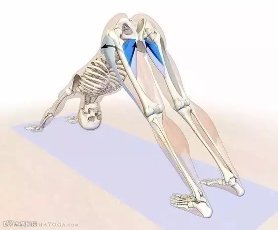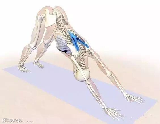 step 2:呼气,双脚脚后跟向下踩,臀部向后向上,将坐骨推到最高点,身体呈倒“V”型;
