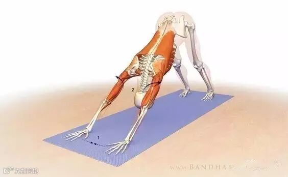 step 4:双手用食指与中指指根以及大鱼际用力推地,手臂、躯干到坐骨一条直线,手臂由腋窝处向外转动,放松双肩和脖子,头部和脊柱在一条直线上。