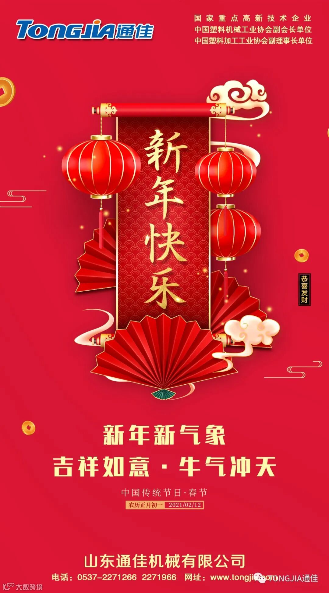 春节到,福气到,金牛送福好运到,在这辞旧迎新之际,让我们欢聚一堂共庆2021年新春佳节。通佳集团全体员工向新老客户朋友们致以节日的问候,并祝大家春节快乐,牛年大吉!凯歌辞旧岁,瑞雪迎新年,希望在2021年里,我们通佳人继续发扬敢为人先、迎难而上的精神,再接再厉,再创辉煌!