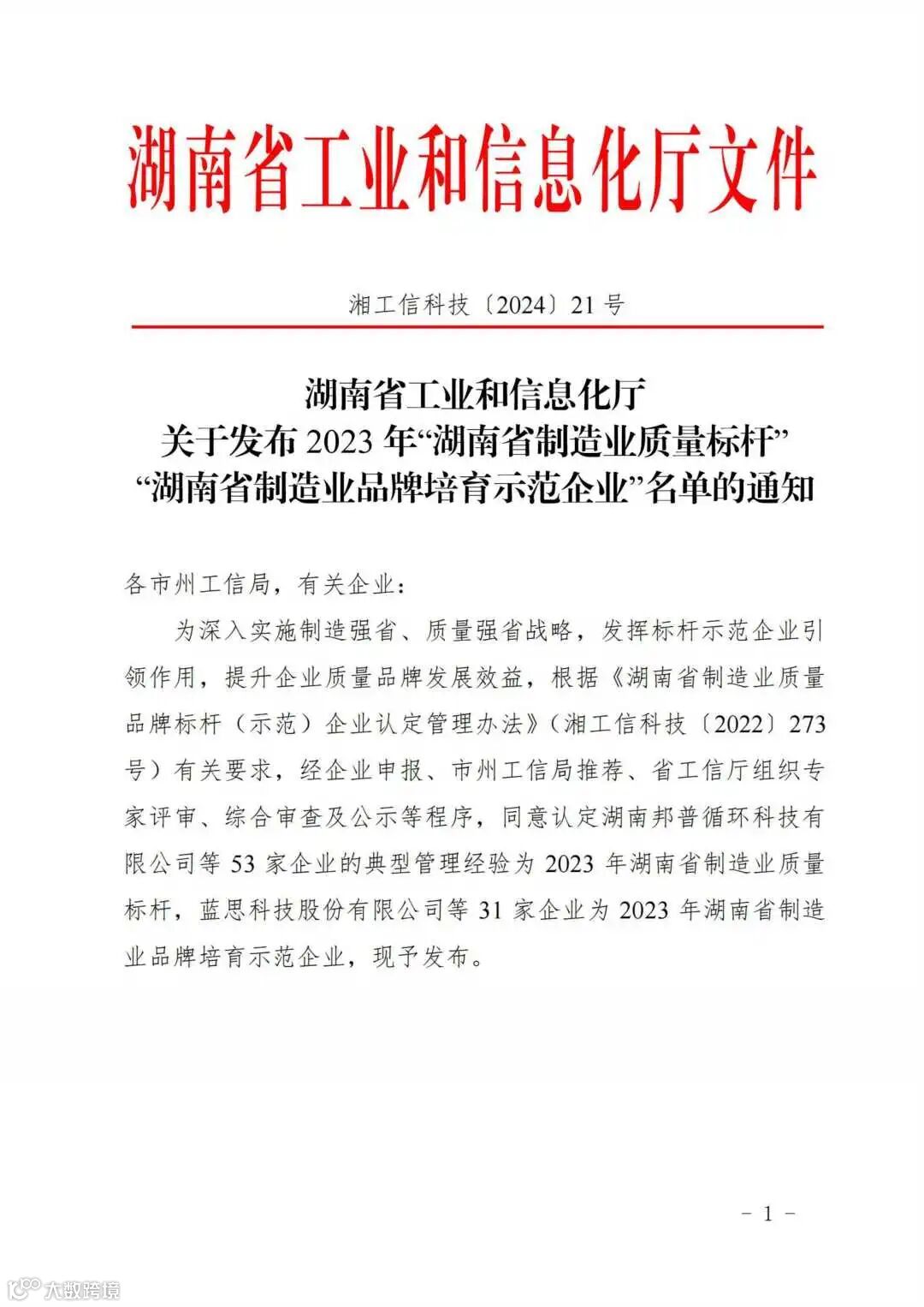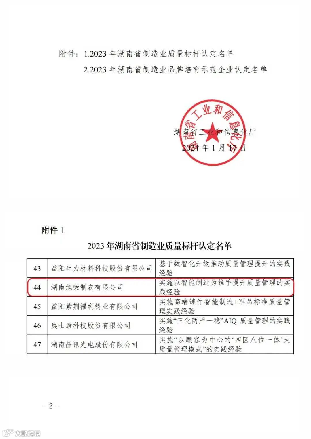 2024年1月18日,湖南省工业和信息化厅在官网上发布了关于2023年“湖南省制造业质量标杆”名单的通知,湖南旭荣制衣有限公司荣获2023年“湖南省制造业质量标杆”荣誉称号。这是“旭荣”新年收获的第一份荣誉。荣誉的获得是对“旭荣”产品质量的充分肯定,也对“旭荣”继续加快产业升级提振信心。在新的一年里,旭荣制衣将在湖南实施制造强省、质量强省战略中继续贡献“旭荣”力量。