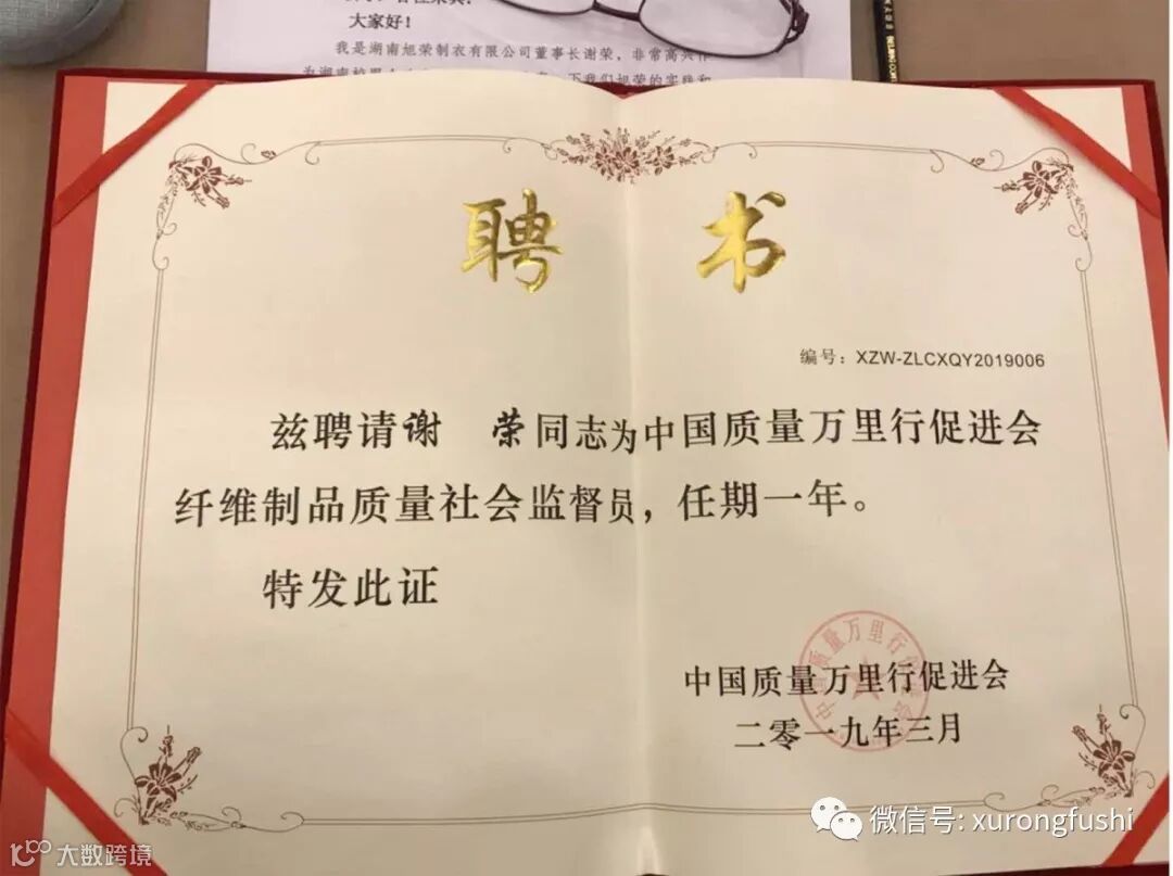 谢荣女士被聘为“中国质量万里行促进会纤维制品质量社会监督员”