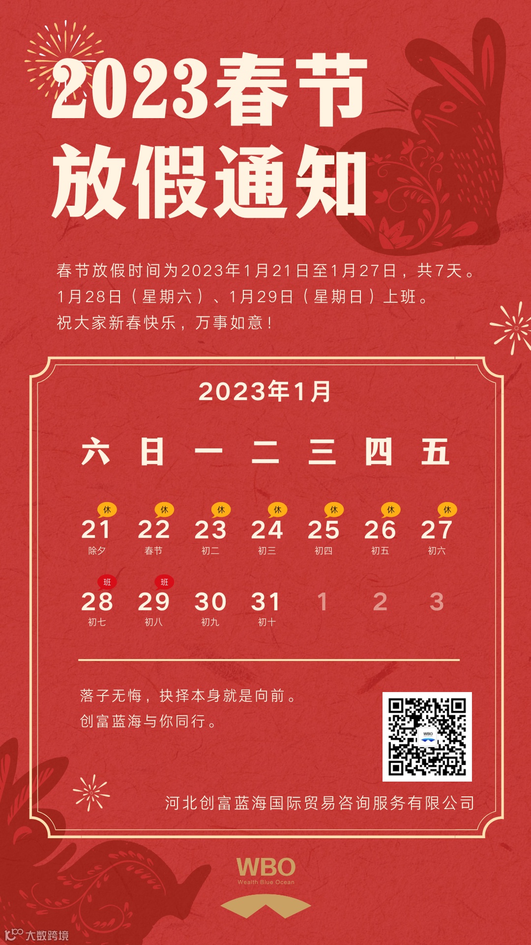 瑞虎随冬去,玉兔踏春来,在这辞旧迎新的美好时刻,祝愿所有外贸同仁春节快乐!阖家幸福!