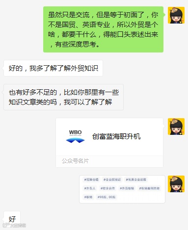 我们跟小A沟通后发现,他的学历虽然一般,但经验比较丰富,而且求职意向比较明确,对外贸行业也很了解。创富蓝海的小姐姐也针对他的情况,帮助他重新将经验梳理提炼成简历要点,并且匹配了与他经验吻合的企业进行面试。交流会现场与企业沟通后,他们约好复试时间。刚刚得知消息,小A已经拿到offer,准备入职了。