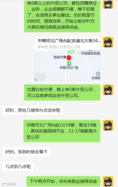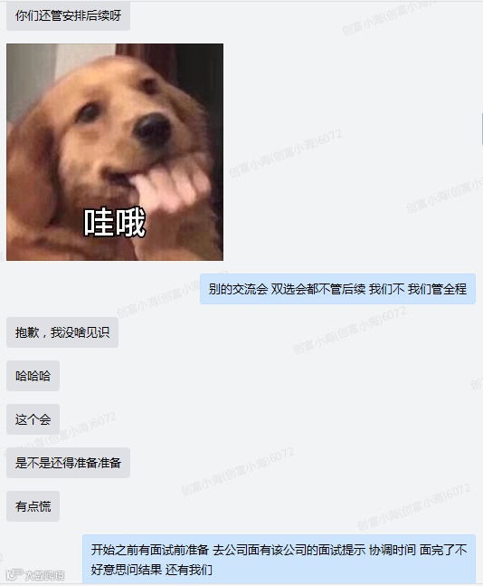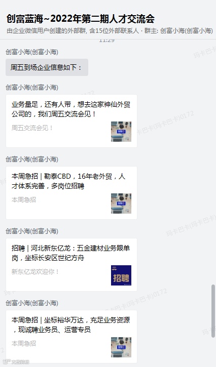 专属微信群会在交流会开始前,提前告知大家到场企业招聘信息、招聘岗位,还会教大家如何选择工作,才能确保不走偏方向等等。