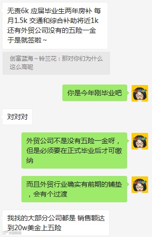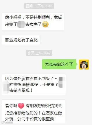 这个学生在遇到我们之前,已经在2家外贸公司实习过了,但可能由于自己对外贸行业不了解,没有经验,进了2家不太好的公司,然后对外贸行业就不太有信心。最后,选择了某房地产公司。