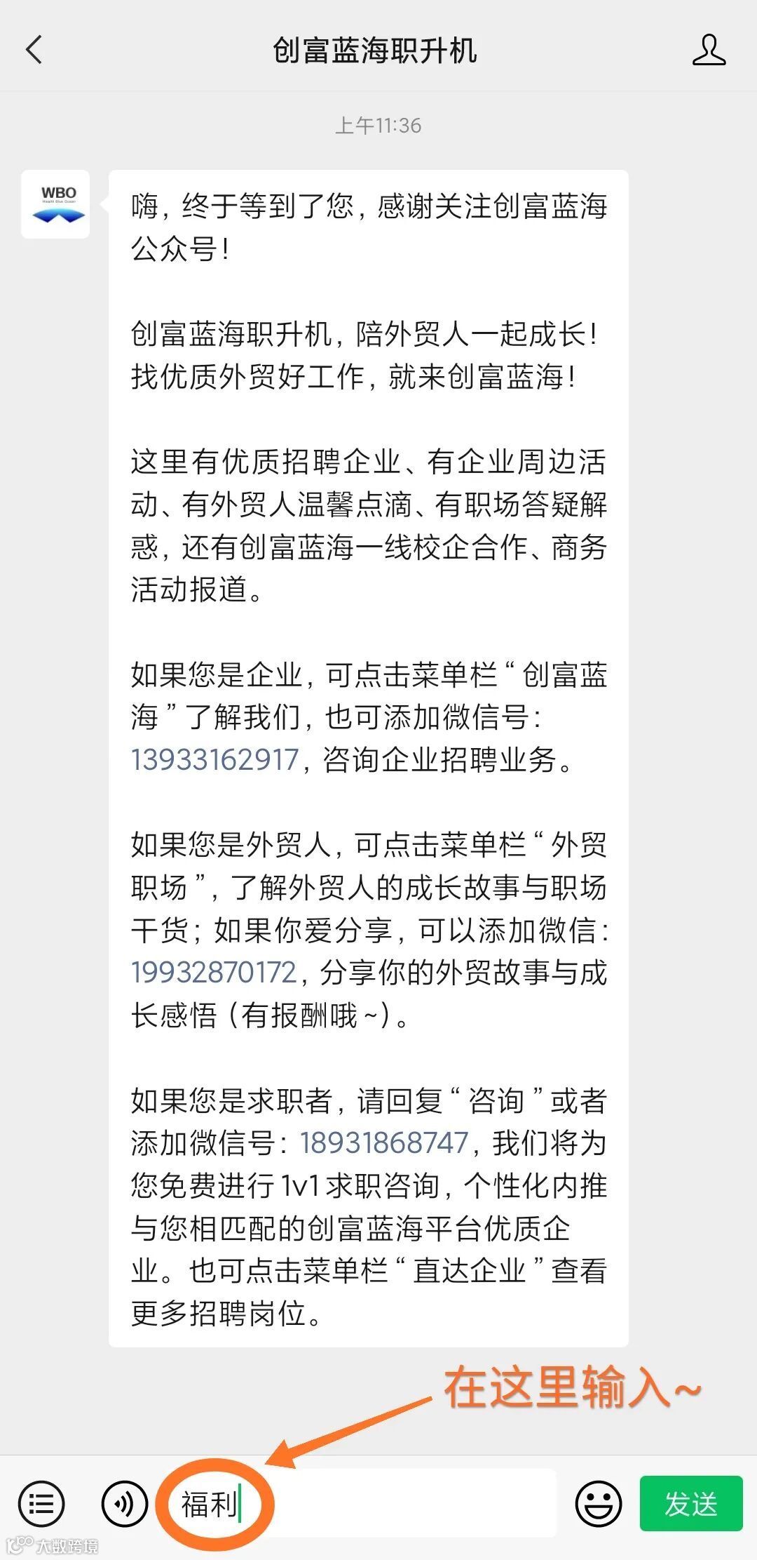 第二步:在【创富蓝海职升机】公众号后台回复关键词【福利】,生成带有自己头像和昵称的专属海报~