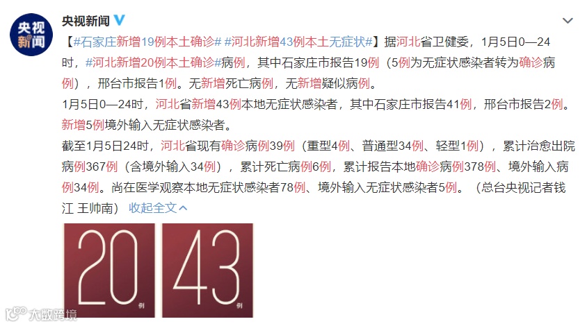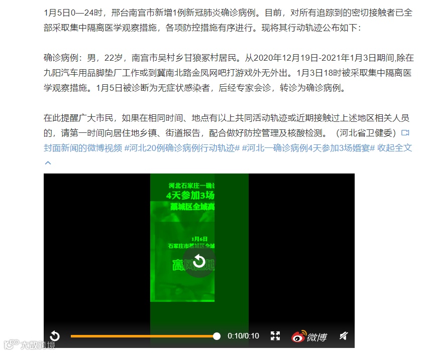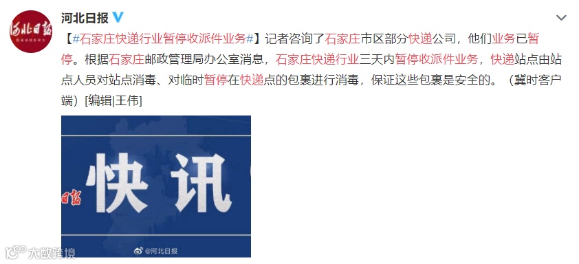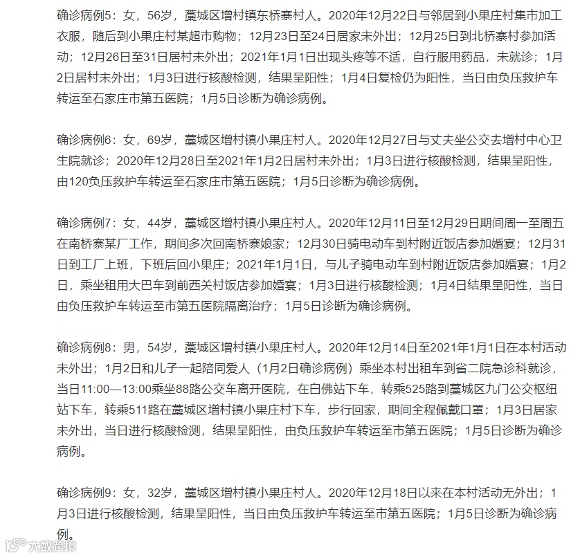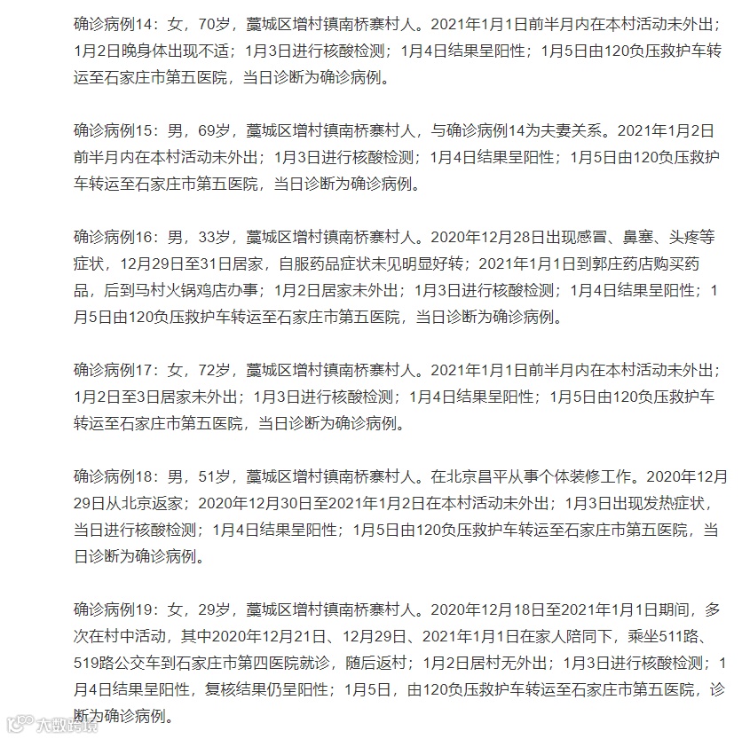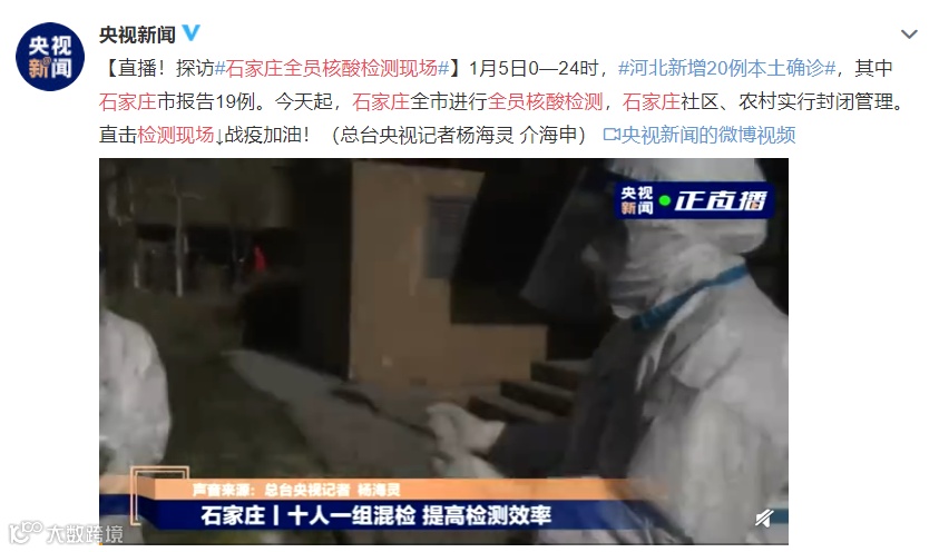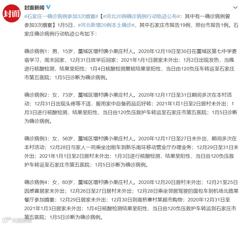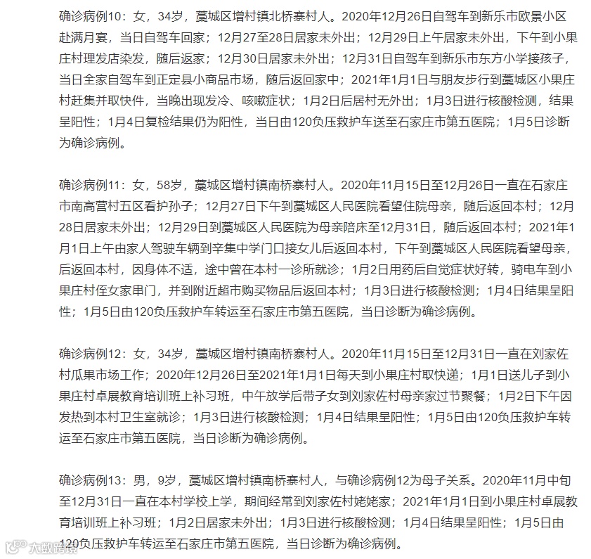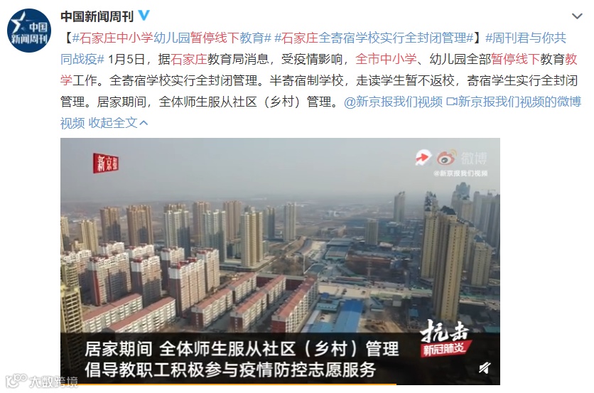 2021年1月5日晚,河北宣布进入战时状态,新闻发布会结束后,石家庄全市所有社区、农村实行闭环管控,全员进行核酸检测。此外,石家庄教育局宣布全市中小学、幼儿园全部暂停线下教育教学工作。