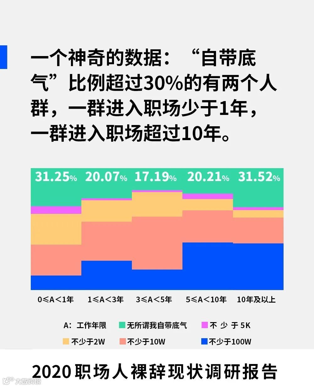 还有一个神奇的数据:裸辞“自带底气”比例超过30%的有两个人群,一群进入职场少于1年,一群进入职场超过10年。