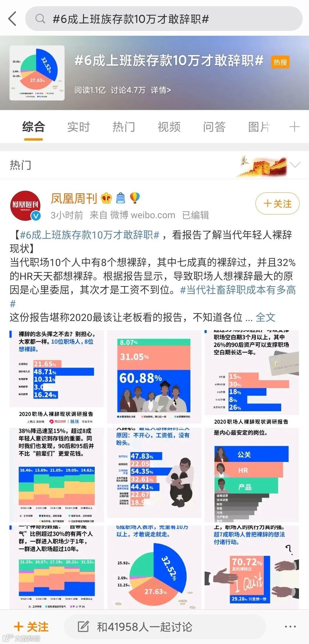 今天,#6成上班族存款10万才敢辞职#出现在微博热搜。