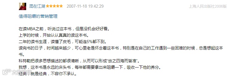 《营销管理》被《金融时报》(Financial Times)评选为有史以来最伟大的50本企管图书之一。不管是资深学者,还是研究营销理论的新人;上至企业的高层管理者,下至普通的一线销售人员,科特勒的《营销管理》都是一部经典的教科书和营销指南。