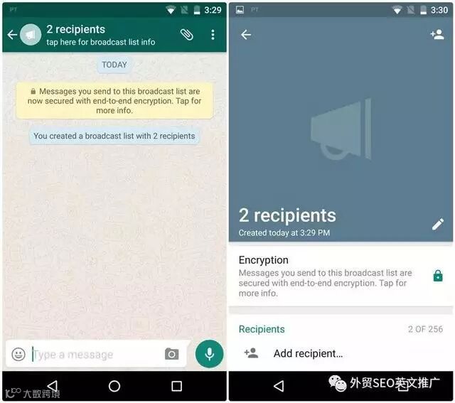 添加完好友以后,除了一对一的发消息外,WhatsApp还提供了一些强大的功能帮助你实现营销目的。