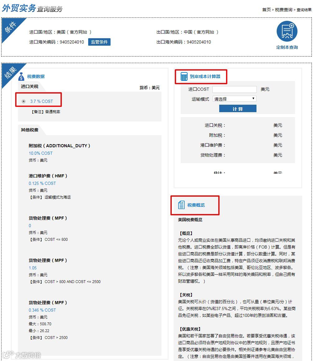 大家可以看到查询结果,非常清楚、详细,竟然还有到岸成本计算器,以及美国的税费概览知识科普。可以说是十分有用了。
