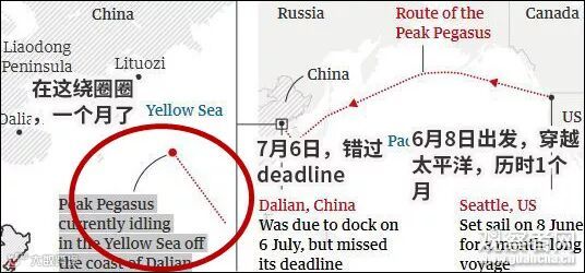据钛媒体11日称,根据此前“飞马峰号”上报的到港申请显示,该船原本预计靠泊时间为7月29日,启程离港的时间为8月2日。但船讯网显示,近一个月内该船仍在大连港附近徘徊,未能成功卸货返航。
