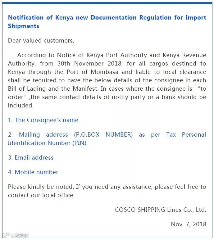 根据肯尼亚港务局及肯尼亚税务局的要求,自2018年11月30日起,通过蒙巴萨港进口至肯尼亚的货物需在提单和舱单中显示收货人的以下信息,如收货人为“TO ORDER”,则需显示通知方或者银行的以下信息: