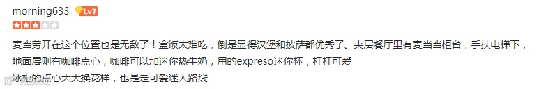 把麦当劳放在第一位,好像不需要什么理由了。一个人用餐方便卫生,陪客户用餐或小坐,这么International的餐厅,客户也有“宾至如归”的感觉。