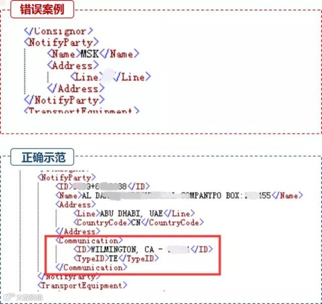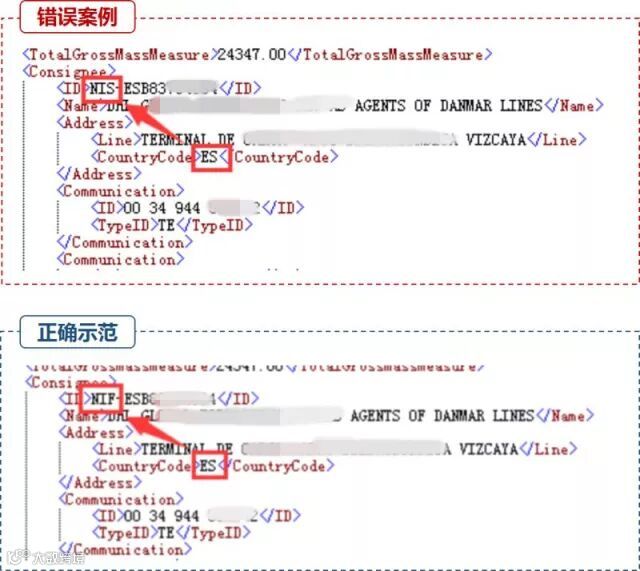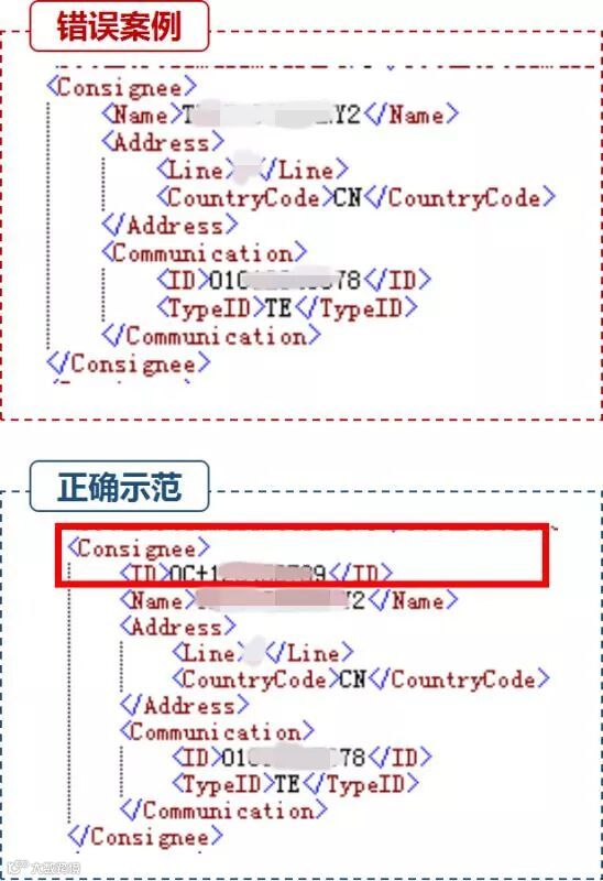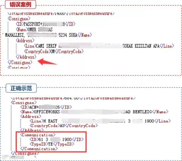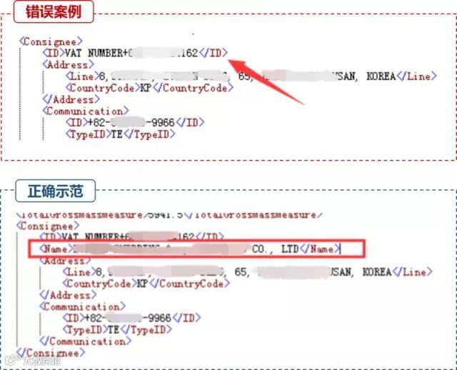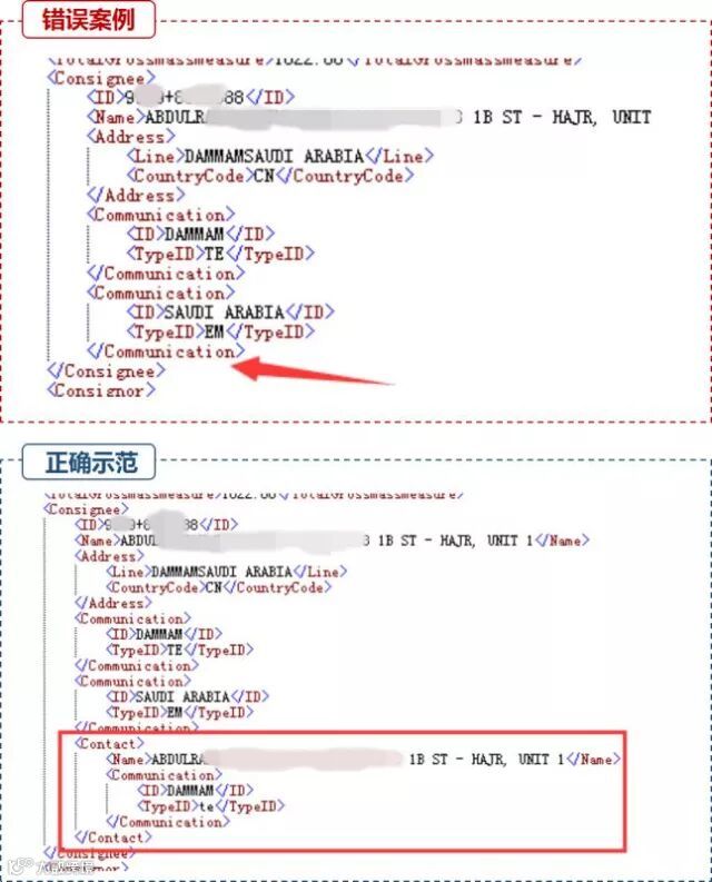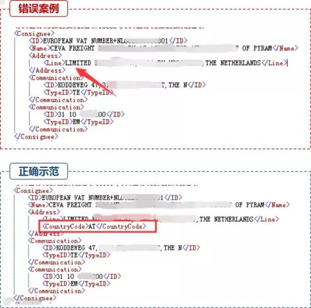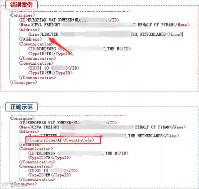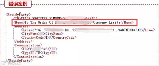 错误示范:条件项未填。系统退单提示:“ 11141 不接受传输,收货人不是TO ORDER时,必须填写收货人信息中的国家代码”、“11143 不接受传输,收货人名称不是TO ORDER时,必须填写收货人具体联系人名称”